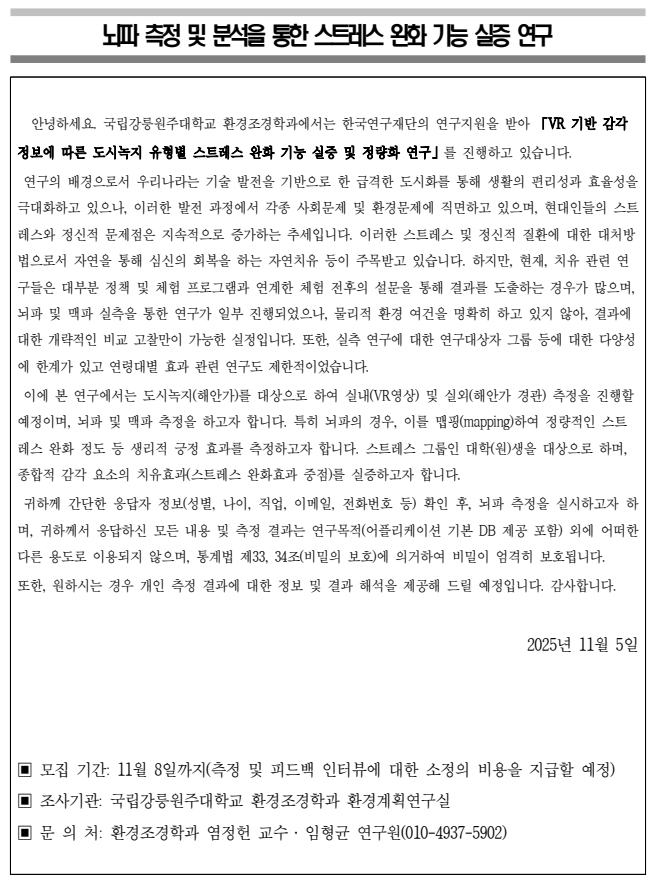 환경조경학과 환경계획연구실 연구대상자 모집 공고