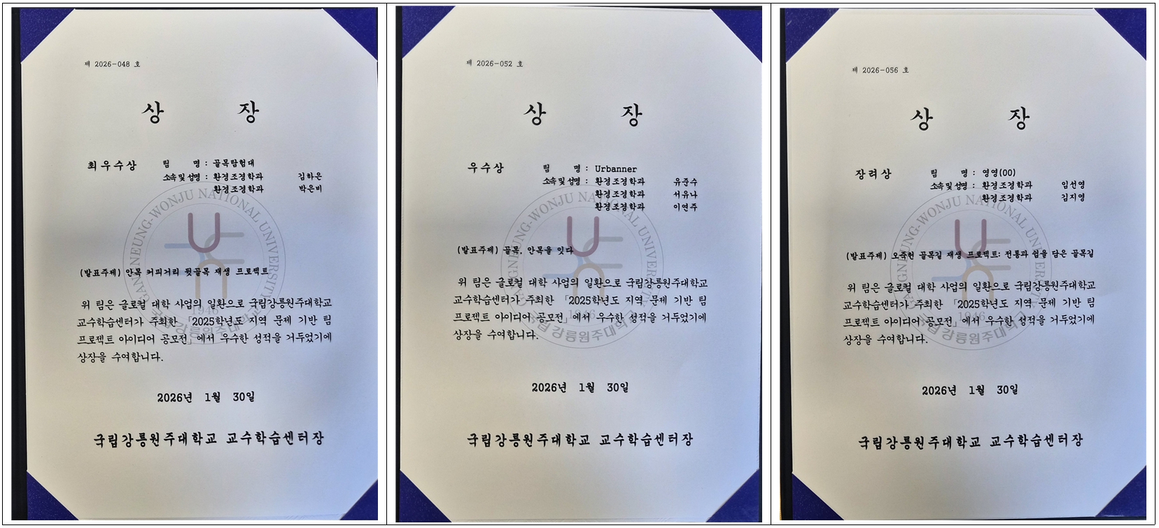 국립강릉원주대학교 환경조경학과 학생들이 교수학습센터가 주관한 2025학년도 지역 문제 기반 팀 프로젝트 아이디어 공모전에서 우수한 성과를 거두었다